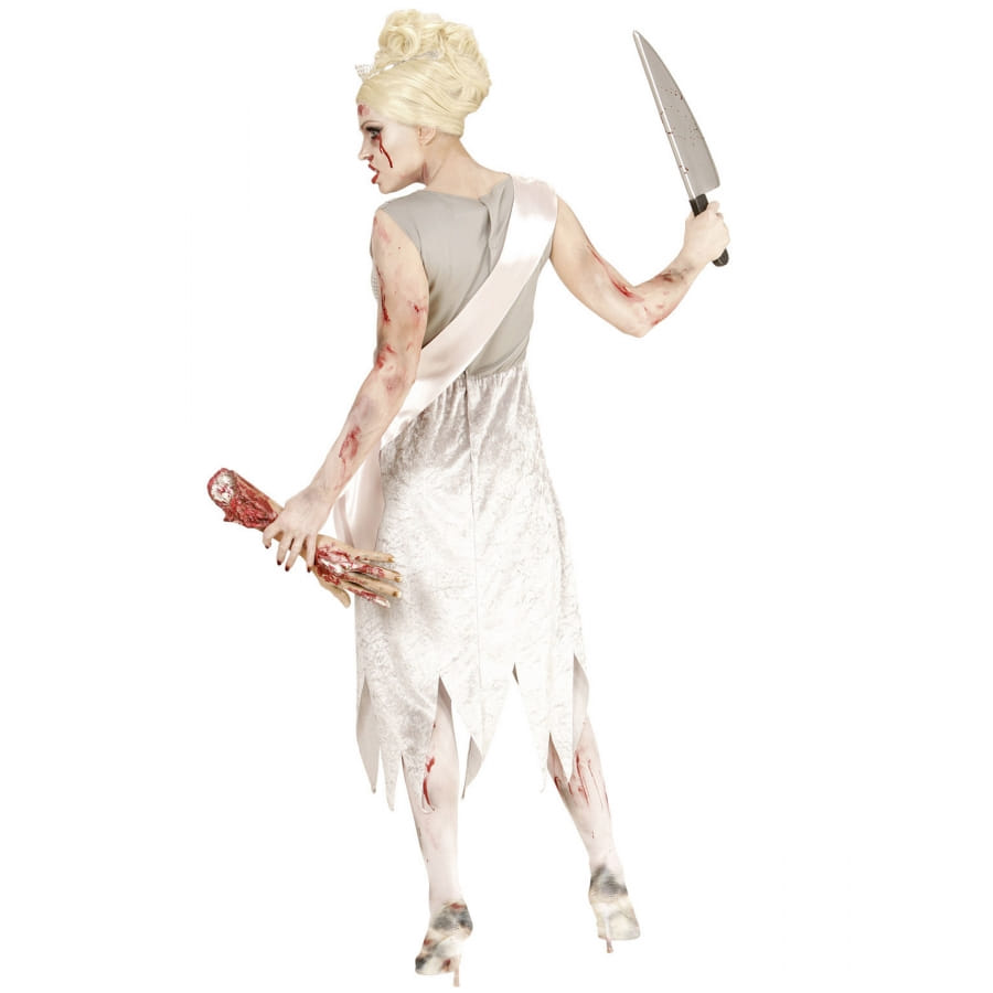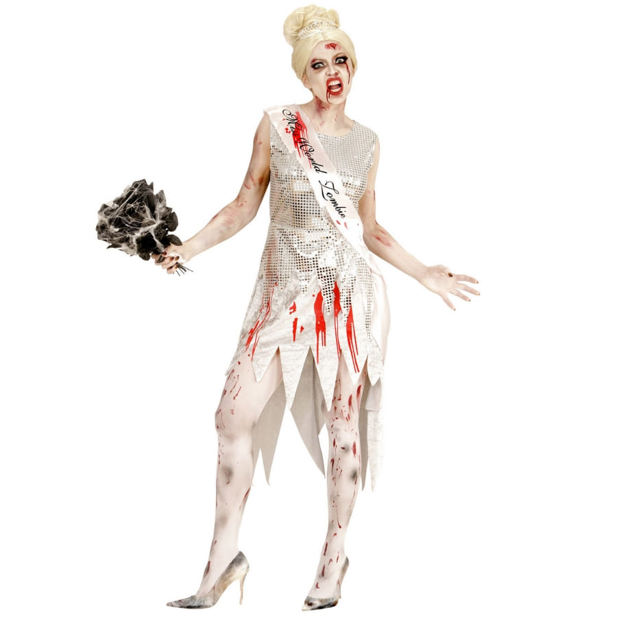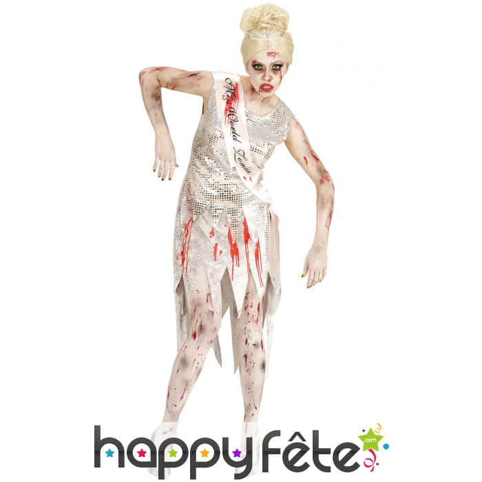 La robe Miss world zombie tâchée de sang avec écharpe adulte est destinée aux femmes.