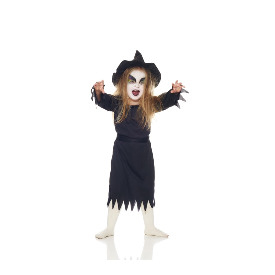 Faites de votre petite fille, une apprentie sorcière qui prend son envol sur un balai magique pour rejoindre les petits monstres de la ville. Grâce à ce déguisement de petite sorcière destiné pour les filles de 1 à 3 ans, elles sont libres de le porter au carnaval de l'école ou à l'occasion d'Halloween. La tenue proposée est une robe noire aux bords découpés en dents de scie avec une ceinture noire. La coiffe pointue et biscornue assortie vient compléter le tout. De cette façon, votre fillette va se mettre dans la peau de kiki la petite sorcière au fil des maisons de votre voisinage pour demander des friandises.