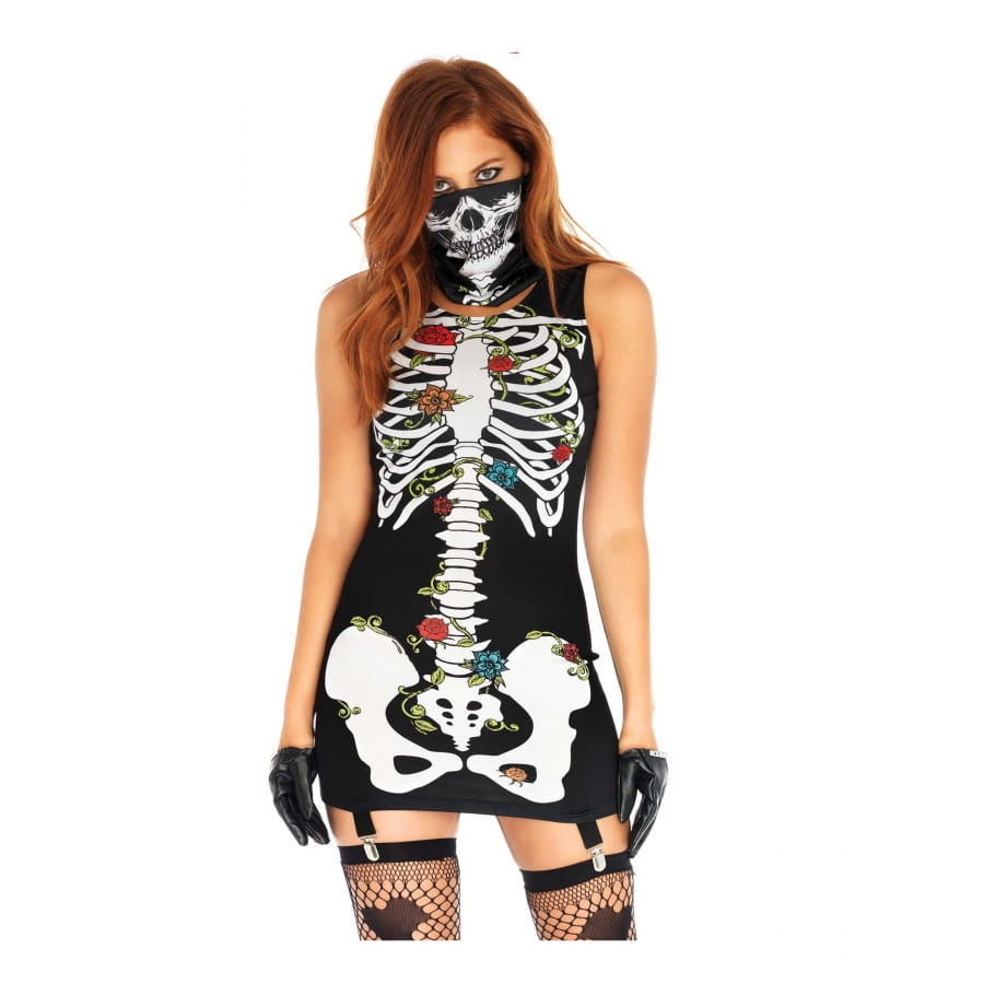 Ce magnifique ensemble très sexy est composé d'une robe ultra courte de couleur noir imprimée d'un squelette blanc orné de fleurs colorées.