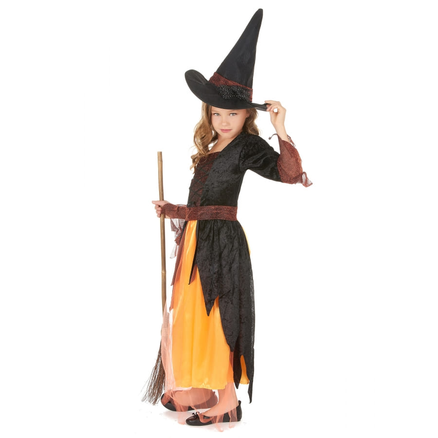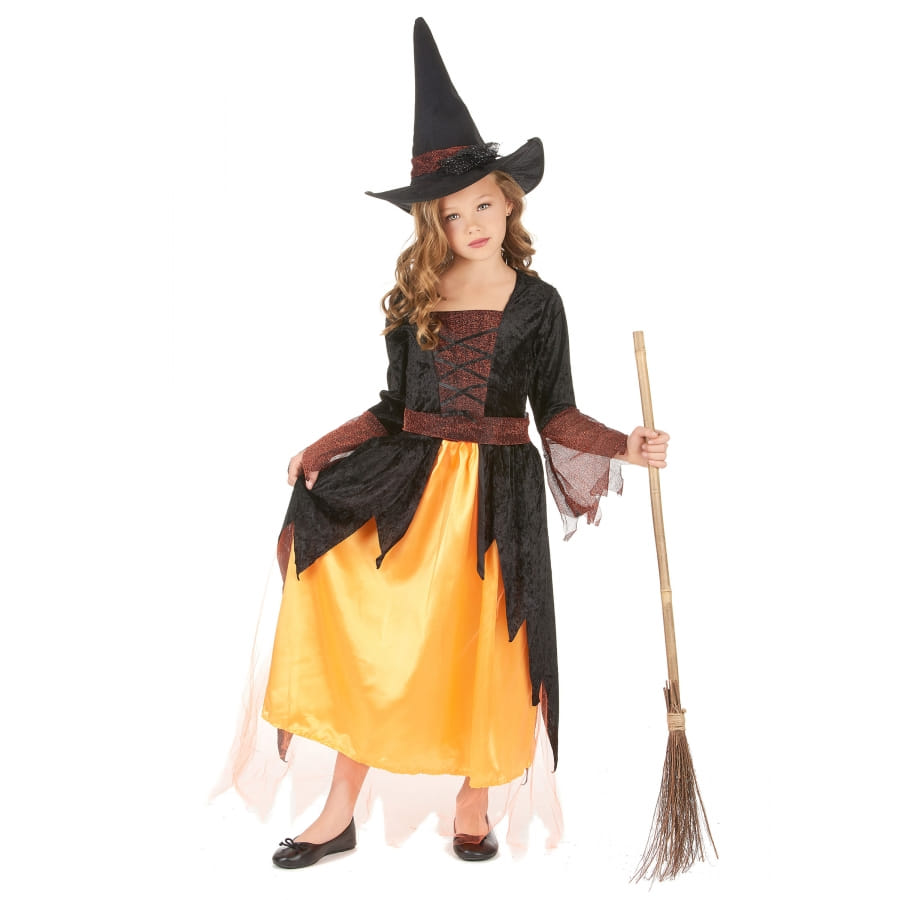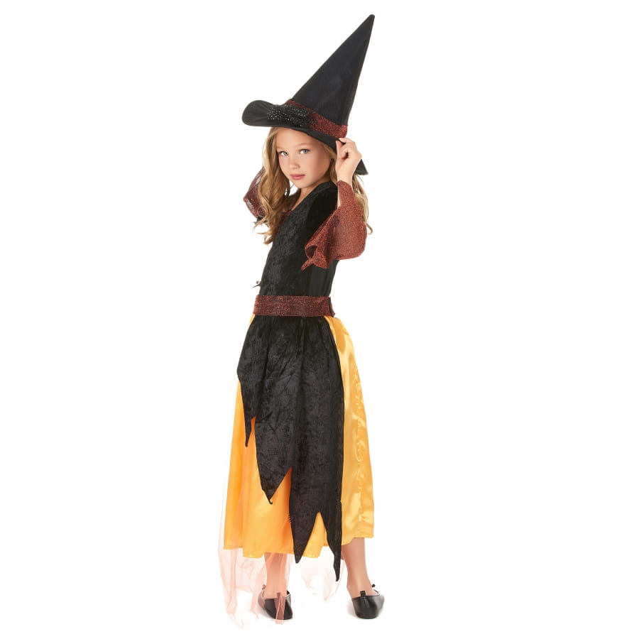 Pour ces petites jeteuses de mauvais sorts, nous leurs proposons la robe noire et jaune de petite sorcière afin qu'elles puissent se déguiser pour Halloween.