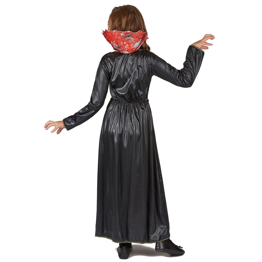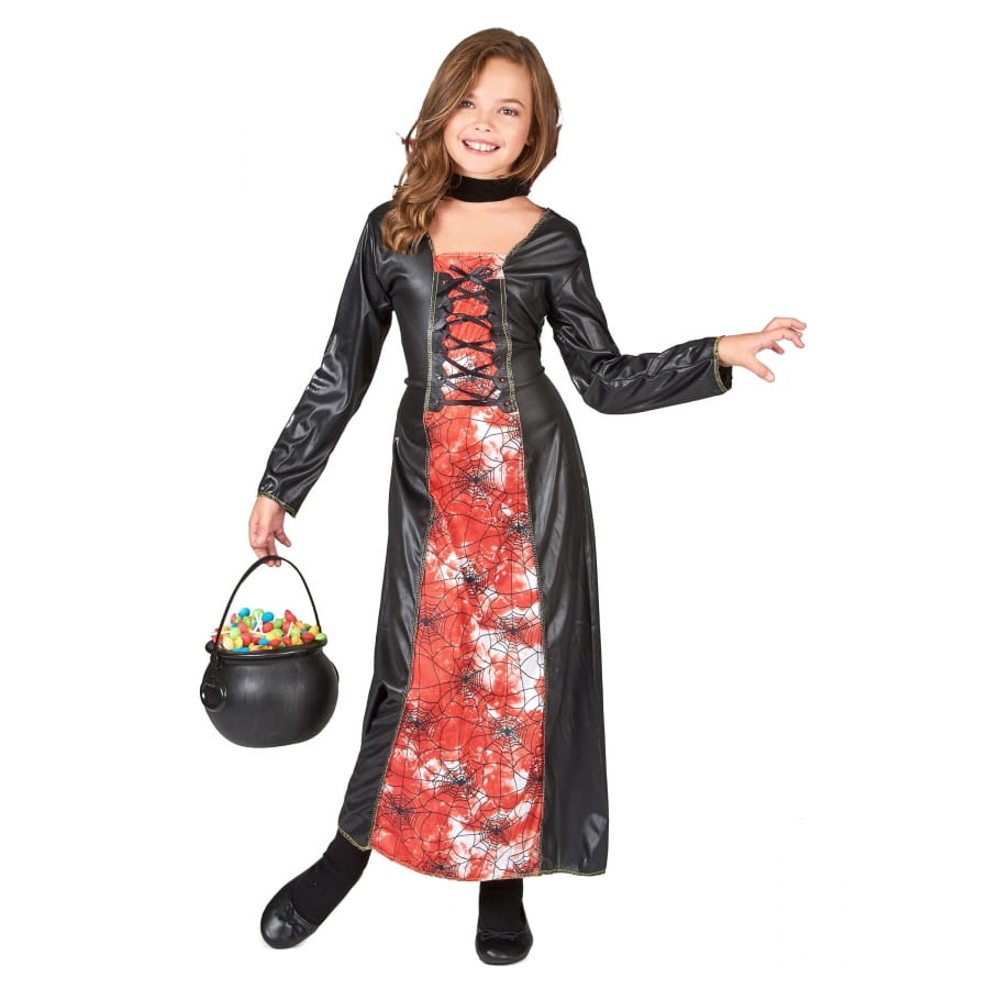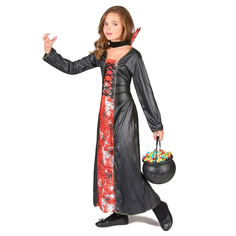 La robe noire et orange imprimé araignées pour enfant est parfaite pour déguiser les fillettes en vampires ou en sorcières.
