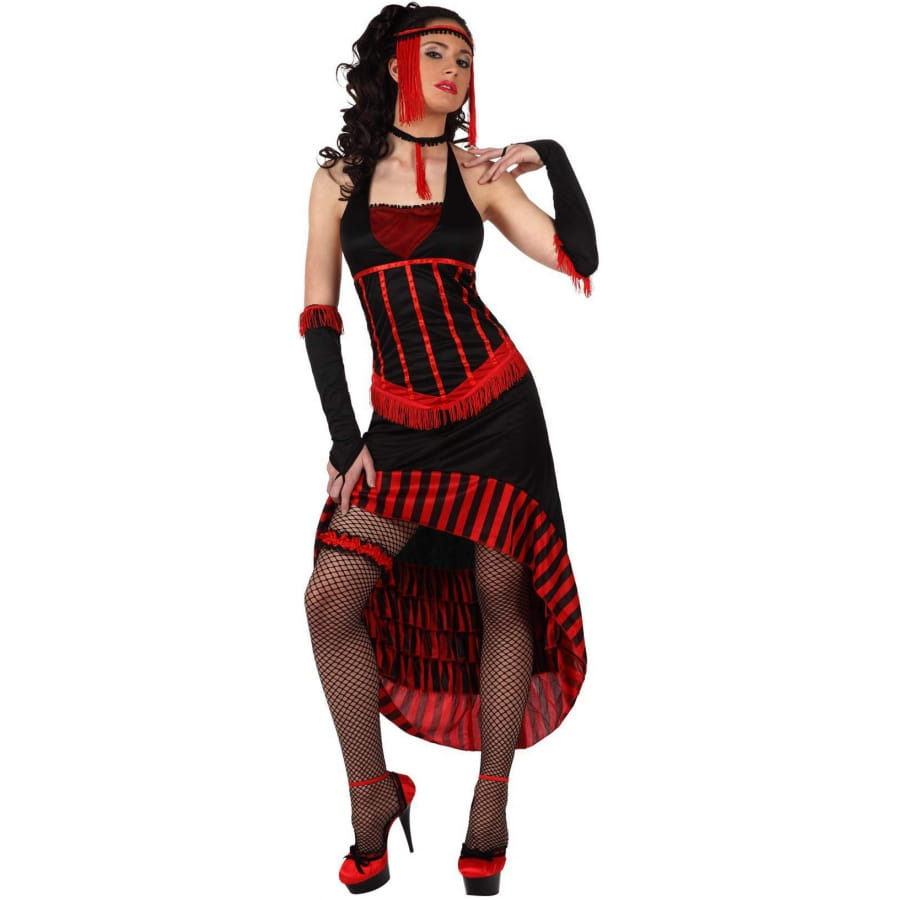 Faire un petit tour dans le passé pour puiser des idées de déguisement est une idée géniale ! Pour preuve, découvrez cette sublime robe noire et rouge de cabaret. Retrouvez-vous dans la peau d'une danseuse de cabaret avec cette robe à dos nu rouge et noir. Des rayures et des franges ornent magnifiquement le vêtement. Vous remarquerez aussi que des liserés satinés rouges ont été cousus sur le haut de la robe. Vous aurez droit à une panoplie d'accessoires pour parfaire votre tenue. Disposez d'un tour de cou et d'une coiffe à franges, ainsi que d'une jarretière rouge bordée de dentelle noire. Une paire de gants termine cette série d'accessoires. Il s'agit de gants noirs à franges rouges qui habilleront vos avant-bras, sans couvrir intégralement vos mains. Tout comme sur la photo, vous pouvez enfiler une paire de collants résille et des talons hauts pour obtenir un parfait look de danseuse.