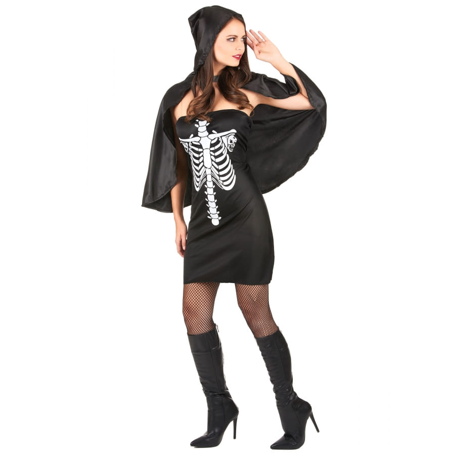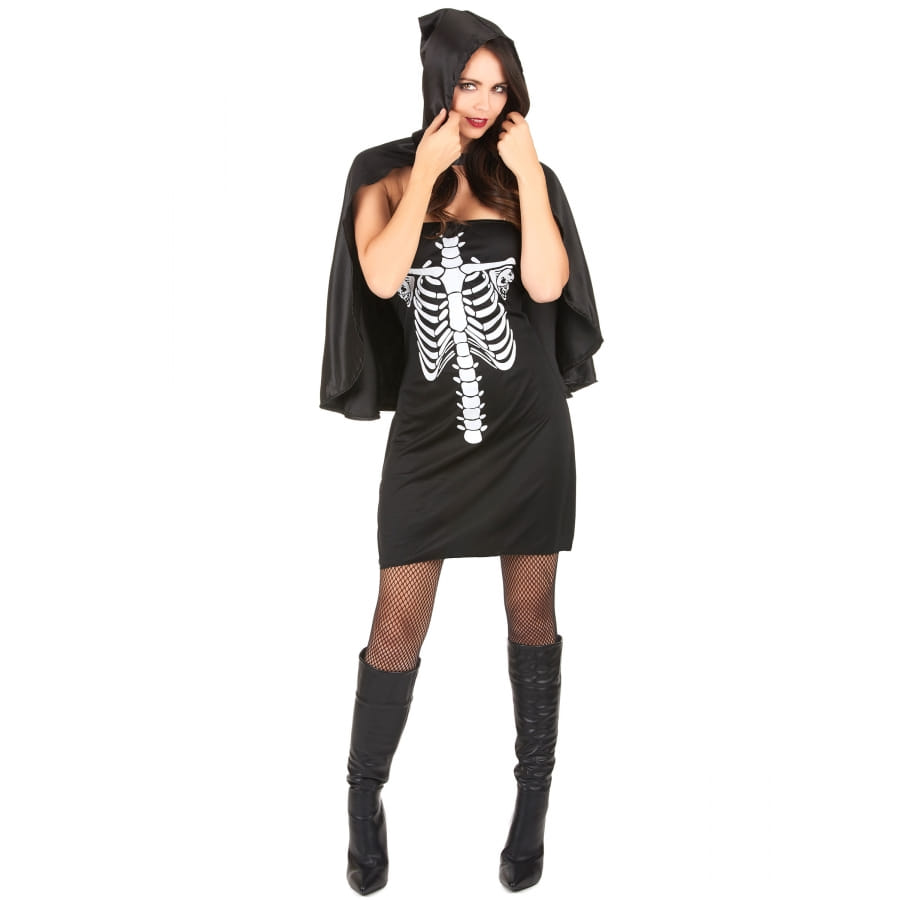 Le déguisement est fait d'une robe courte, de couleur noir, avec un squelette blanc imprimé sur la face avant.
