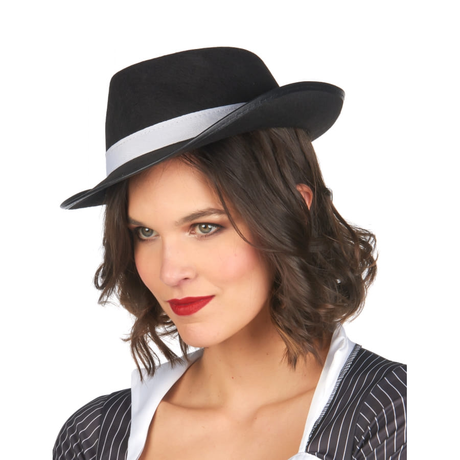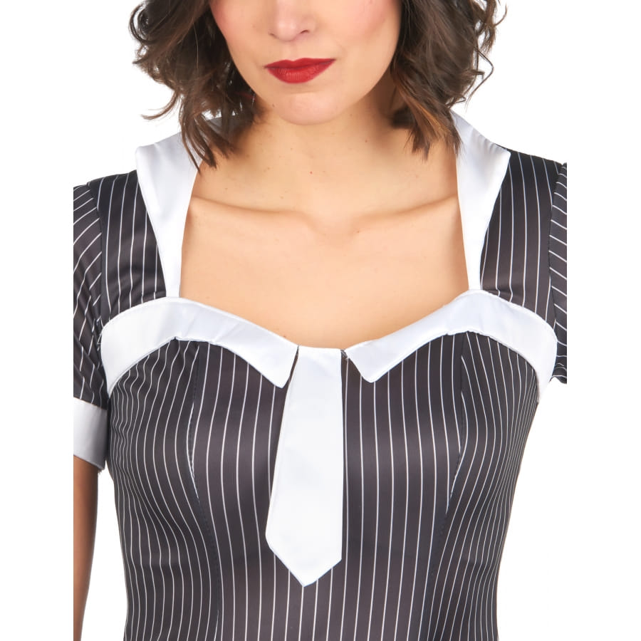La robe noire lignée blanche de mafioso pour femme est vendue accompagnée d'un chapeau.