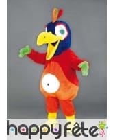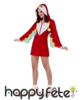 Il est question ici d'une robe courte de couleur principalement rouge munie d'une capuche représentant la tête d'un perroquet.