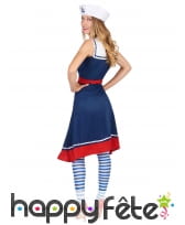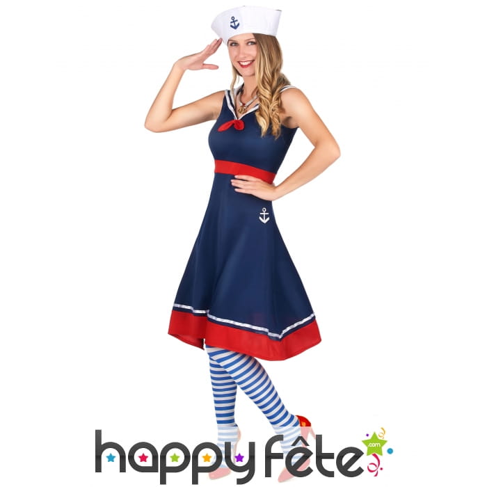 Jouez les femmes en uniforme dans une soirée sur le thème de la marine grâce à la robe rétro de marin bleue et rouge avec chapeau.