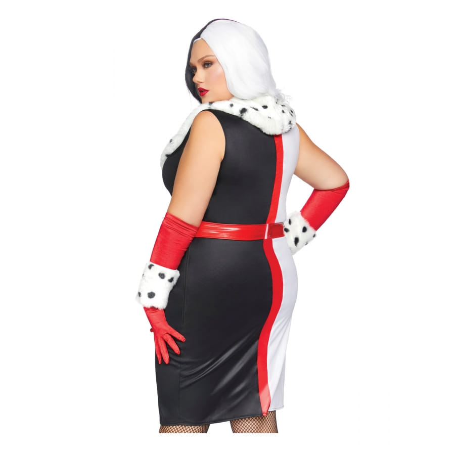 Les manchettes et l'encolure sont recouvertes d'une imitation de fourrure portant les couleurs d'un pelage de dalmatien, avec des taches noires sur fond blanc.