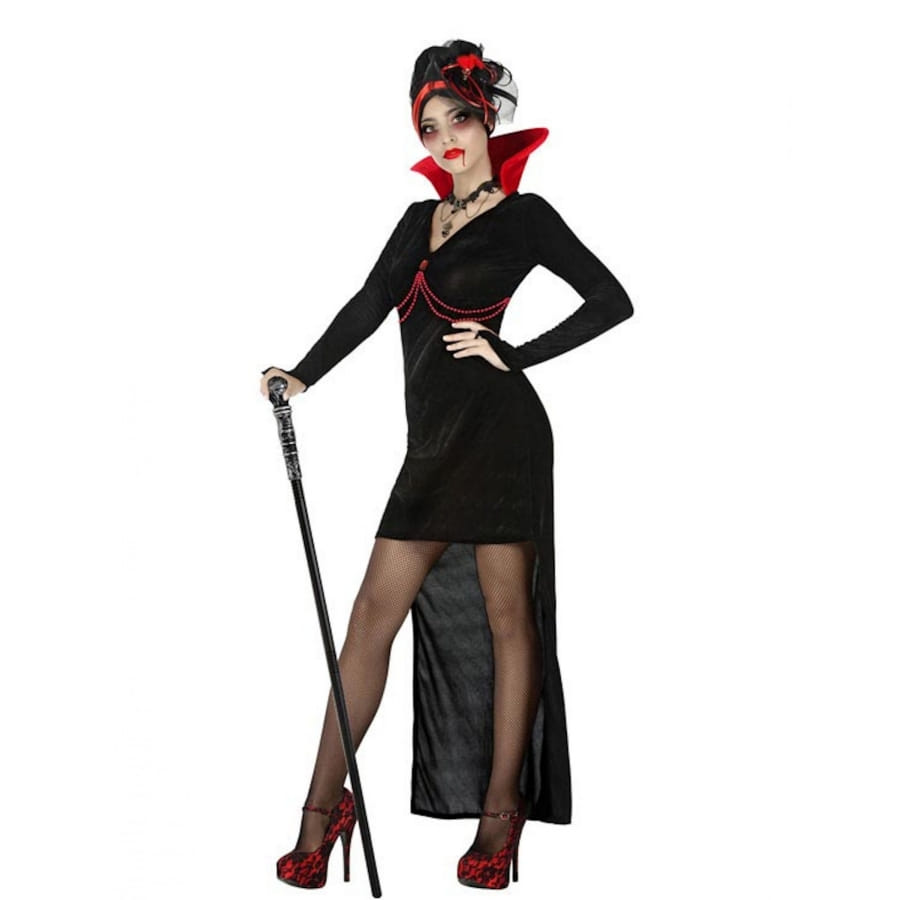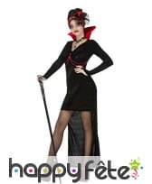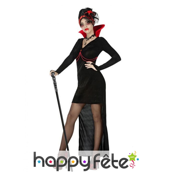 Marquez la soirée d'Halloween de votre empreinte avec la robe sexy de vampire noire avec traine et haut col.