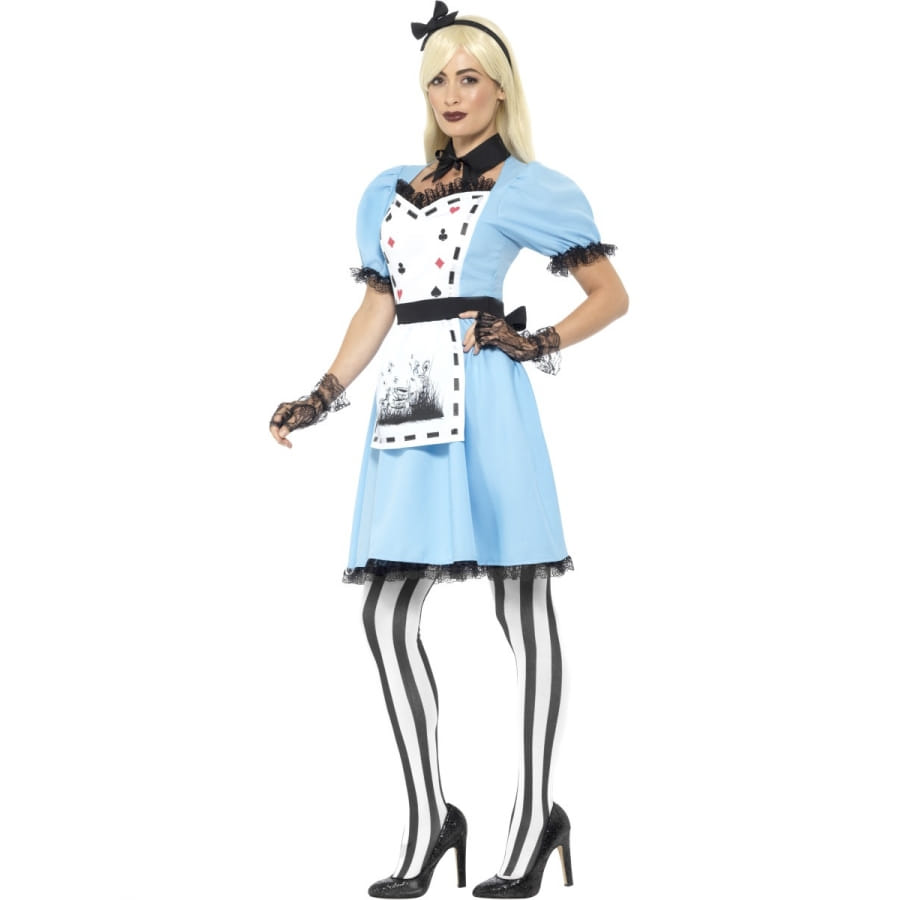 Le monde merveilleux d'Alice ne manque pas d'étonnantes surprises. Pour plus d'originalité, choisissez d'incarner le côté sombre de la fascinante Alice. Le déguisement robe sombre Alice au pays des merveilles, adulte est l'article parfait pour vous Mesdames. Il est principalement formé d'une robe bleue et noire avec tablier intégré. Sur le tablier blanc ont été imprimés des motifs de jeux de carte. Comme accessoires, disposez d'un collier noir avec allure de col ainsi que d'une paire de mitaines noires. Le bandeau noir apportera un petit plus à votre coiffure. L'ensemble est sous licence Disney. Ce costume aura du succès pour Halloween, et aussi pour fêter un joyeux non anniversaire en compagnie de vos amis !
