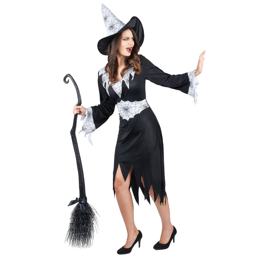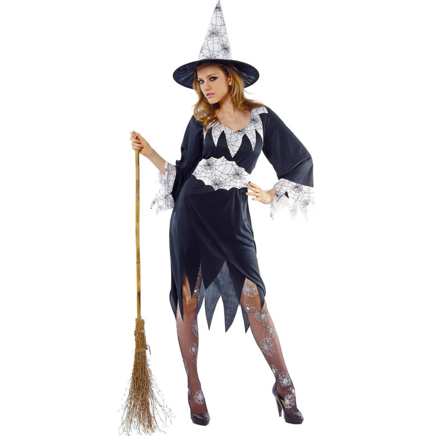 Magie noire ajoutée aux mauvais sortilèges feront un cocktail mortel pour la fête des morts car nous vous proposons la robe sorcière noire imprimé toiles fond blanc.