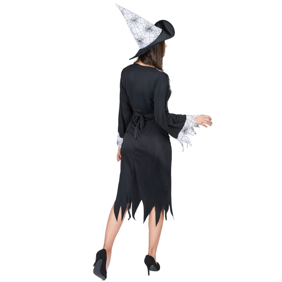 Pour compléter le costume, nous présentons une ceinture blanche et un chapeau de sorcière pointu, toujours imprimé de toiles d'araignées.