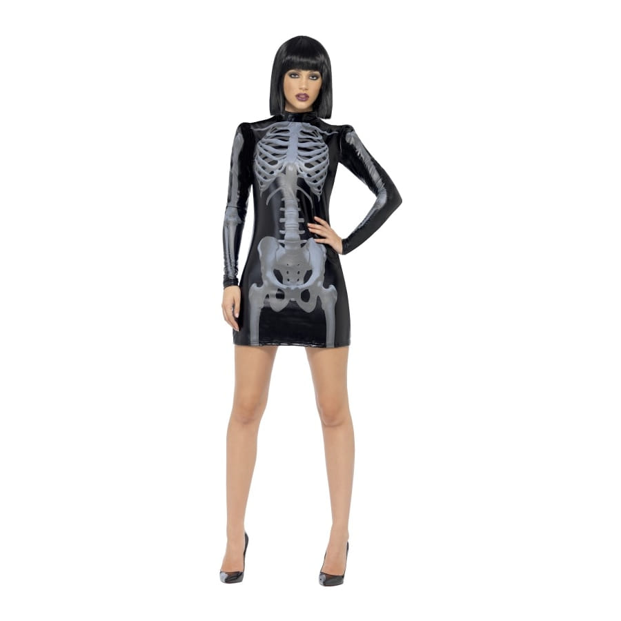 Mesdames, vous êtes à la recherche d'un déguisement qui soit à la fois innovant, qui fasse peur et qui vous mette en valeur? Et vous croyez que ça n'existe pas? Ce costume existe bel est bien, celui-ci en est un exemple. Il est fait avec une robe noire, imprimée en blanc du dessin d'un squelette, et pas n'importe quel dessin de squelette mais un dessin en trois dimensions. En effet, avec ce dessin 3D, il est possible de voir plus en détail le squelette et plus réaliste que ça, ça n'existe pas. De loin, dans le noir, on pourrait même penser que c'en est un vrai. Cette robe vous met également en valeur parce qu'elle est assez moulante et un peu courte. Vous n'avez plus qu'à mettre vos plus jolis escarpins noirs à talons et vous aurez votre joli déguisement. Les tailles disponibles sont : XS(32-34), S(36-38), M(40-42) et L(44-46).