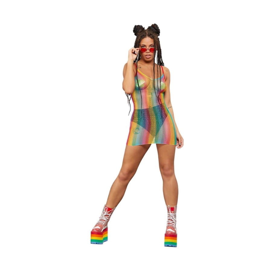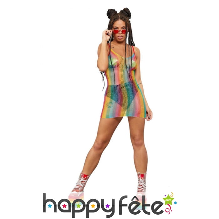 Sortez le grand jeu lors d'une soirée où tout est permis, en arborant cette robe transparente courte arc-en-ciel en résille.