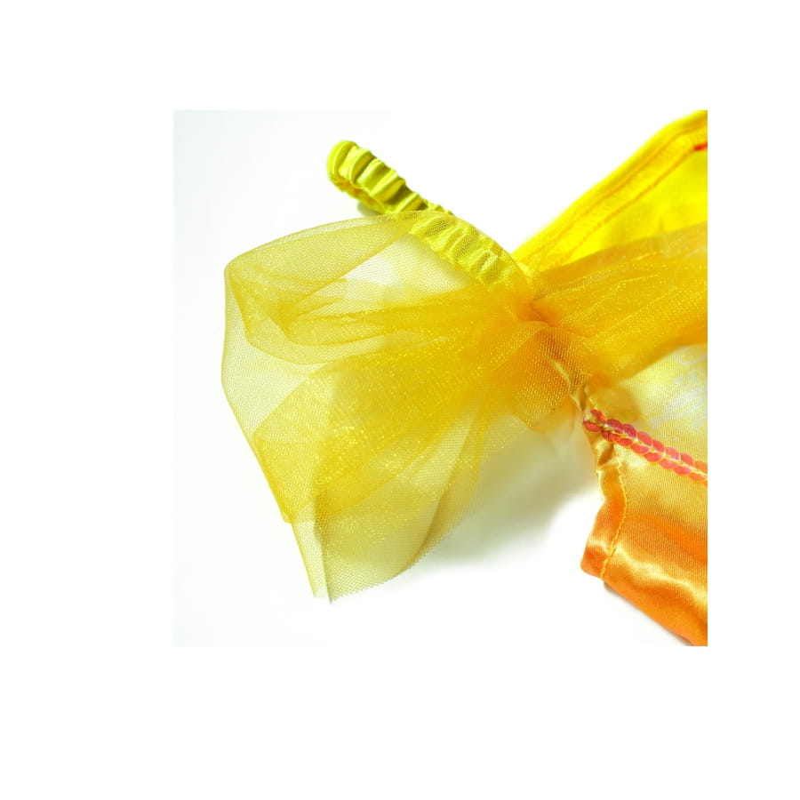 Enfin, une courte sur-jupe imprimée de formes arabesques et pailletées est fixée sur le tour de taille.