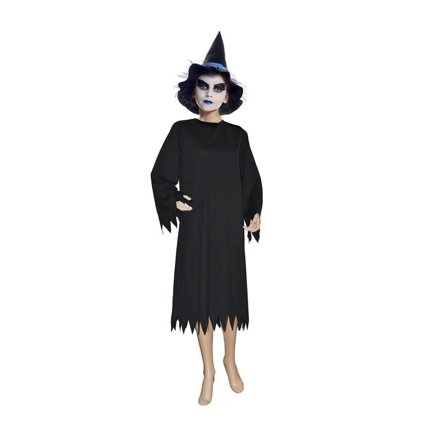 Découvrez ici la robe unie noire de petite sorcière. Il s'agit d'une longue robe intégralement noire unie. Le bas de la robe ainsi que les manches sont découpés d'une façon à ce que ceux-ci ressemblent à un tissu déchiré, en lambeau. Pour accessoiriser la tenue, nous avons ici choisi différents accessoires (non livré avec le costume mais disponibles sur le site dans les catégories accessoires et cosmétiques) comme le chapeau pointu noir et le maquillage blanc et noir. Les lèvres de la petite fille sont recouverte de bleu dans un rappel de la couleur présente sur le chapeau pointu. Bien entendu, vous êtes totalement libre d'accessoiriser ce costume selon vos goûts. N'hésitez d'ailleurs pas à nous faire suivre une photo de votre réalisation. D'avance happy Halloween.