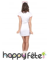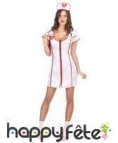 Vous êtes partante pour adopter une tenue d'infirmière, mais pas n'importe laquelle. La robe uniforme blanc d'infirmière sexy devrait vous intéresser. Il s'agit d'un déguisement plein de charme formé par une robe et une coiffe. Il s'agit d'une mini robe de couleur blanche et rouge. Elle est dotée de courtes manches ainsi que d'une fermeture éclair sur le devant. Quant à la coiffe, elle est de couleur assortie à la robe. Un insigne d'infirmière y a été imprimé au centre. Pour un parfait look de séductrice, n'hésitez pas à opter pour des talons hauts, et pourquoi pas une paire de collants couleur chair. Vous retrouverez sur notre site divers accessoires pour personnaliser votre tenue, comme un faux stéthoscope par exemple.