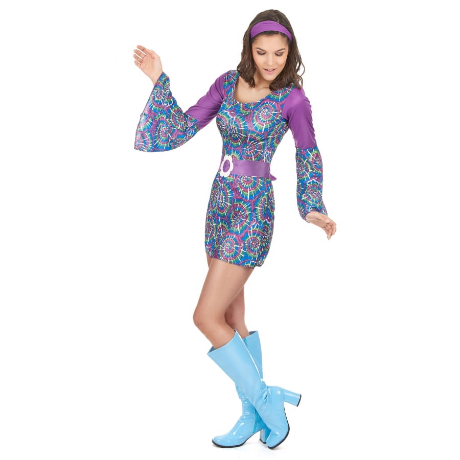 La robe courte en polyester est livrée avec un bandeau violet pour cheveux et une ceinture violette à boucle en plastique en forme de fleur de 8 cm de diamètre.