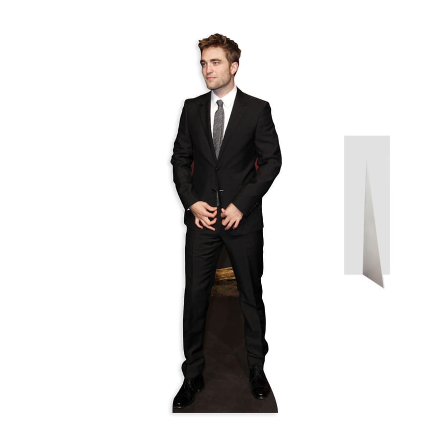 Voilà le beau gosse qui fait rêver toutes les filles en ce moment, des plus petites aux plus grandes : le célèbre Robert Pattison, celui qui joue Edward dans la saga Twilight. Nous avons alors une silhouette en carton qui le représente et qui mesure 186 cm. Nous l'avons immortalisé avec un costume de couleur noire, une chemise blanche et une cravate grise, un style très classique.