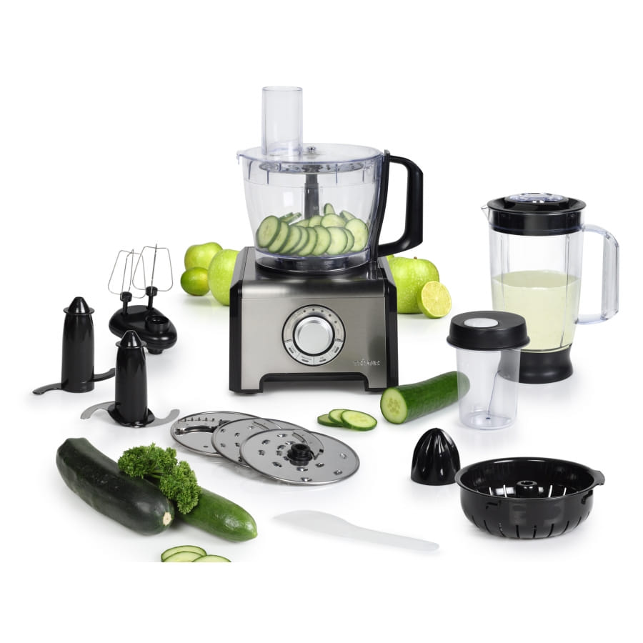 Vous pourrez faire des merveilles culinaires si vous disposez de ce robot multifonction. Nous vous le proposons aujourd'hui, de couleur noire et argentée. Ce robot tranche, mixe, coupe, hache, peut faire des smoothies et de la glace. Et oui, rien que ça ! Vous pourrez finir vos plats en un temps record. Et le gros plus, ce robot de cuisine ne chauffe pas lors de son utilisation.