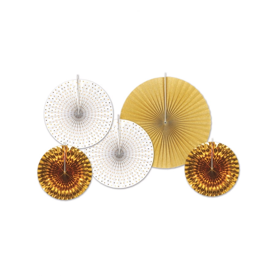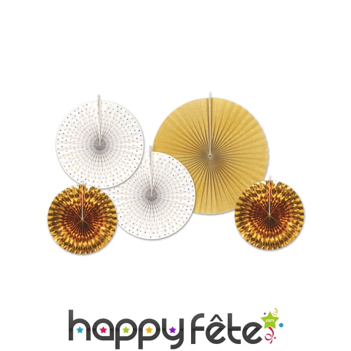 Il est question de 5 rosaces en papier comprenant: 2 rosaces de couleur or métallisé (24 cm de diamètre), 2 rosaces blanches avec des motifs en forme de petits triangles dorés (30 cm de diamètre) et 1 grande rosace de couleur or (40 cm de diamètre).