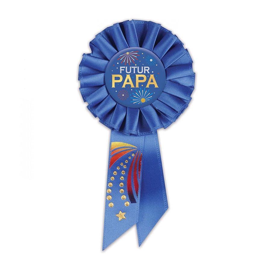 Sur la cocarde sont imprimés de nombreux motifs festifs au centre desquels se trouve l'inscription "FUTUR PAPA".