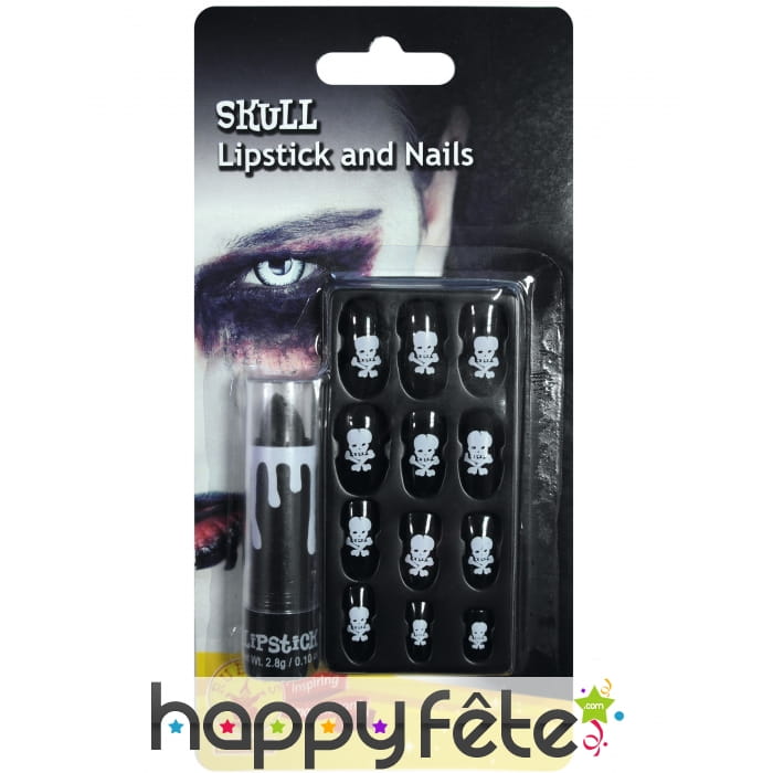 Le kit composé d'un rouge à lèvres et de 10 ongles crâne est destiné aux femmes.