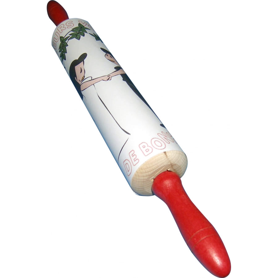 Rouleau à patisserie de fabrication française de couleur rouge avec dessin original et rigolo pour jeunes pacsés. Offrez-le à vos amis pour leur souhaiter vos meilleurs voeux.