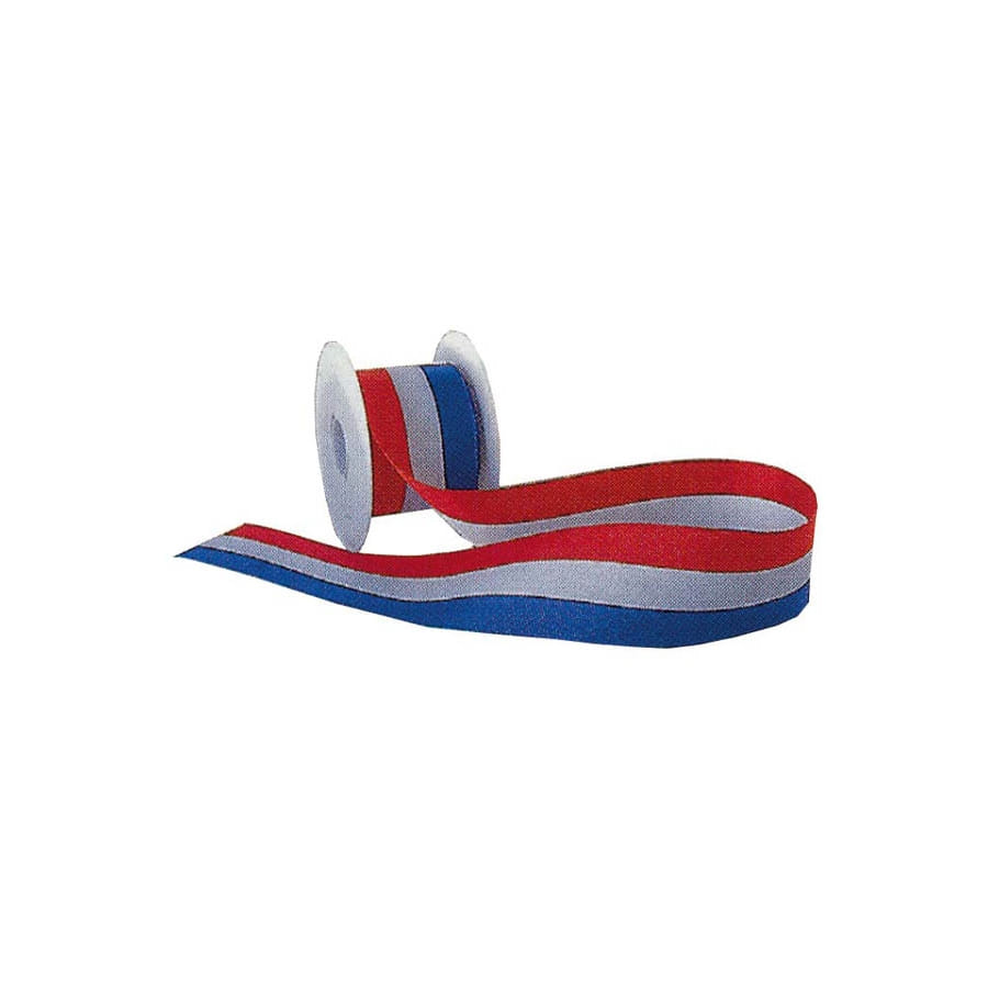 Ruban bleu, blanc et rouge. Cet accessoire est disponible en 6 différentes tailles: 10 millimètres de largeur sur une longueur de 25 mètres, 15 millimètres sur 25 mètres, 25 millimètres sur 25 mètres, 38 millimètres sur 25 mètres, 50 millimètres sur 25 mètres et 66 millimètres sur 25 mètres. Ce ruban est parfait pour une inauguration ou pour une fête nationale.