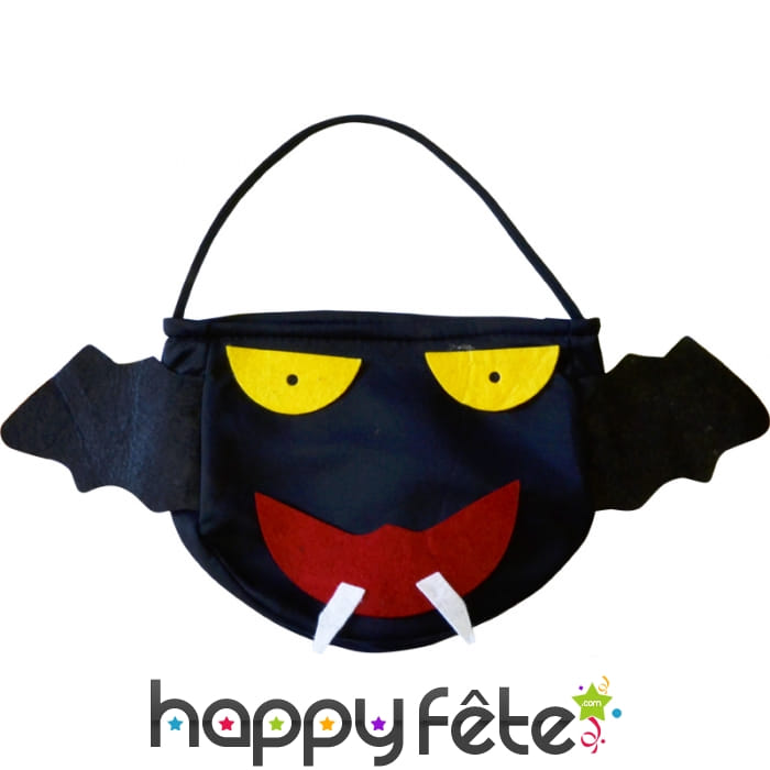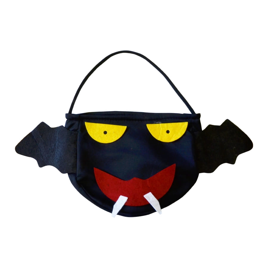 Sac à bonbons Halloween en forme de chauve-souris pour enfants. Ce sac mesure 26 centimètres sur 20, avec une anse de 30 centimètres de haut et des ailes de 45 centimètres. Ce petit sac drôle est parfait pour une récolte de bonbons lors de la nuit d'Halloween ou pour agrémenter un déguisement.