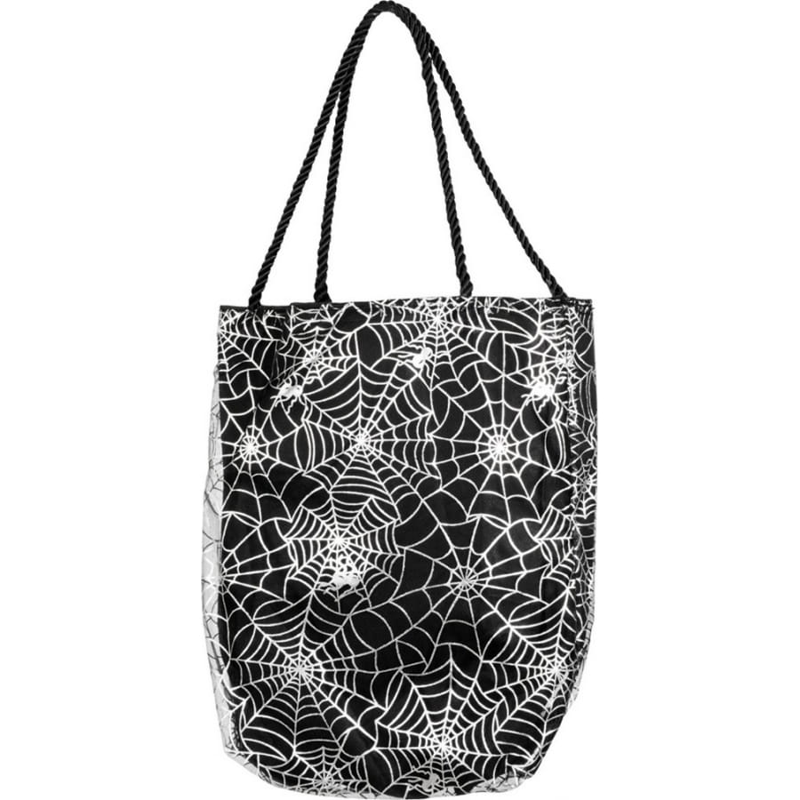 Le sac à bonbons noir est imprimé de dessins de toiles d'araignée argentées.