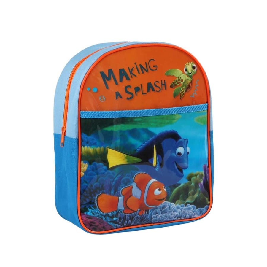 La partie avant du sac présente une grande poche ouverte et imperméable à l'eau, Némo et son amie Dory y sont représentés entrain de nager dans l'océan sous un fond bleu.