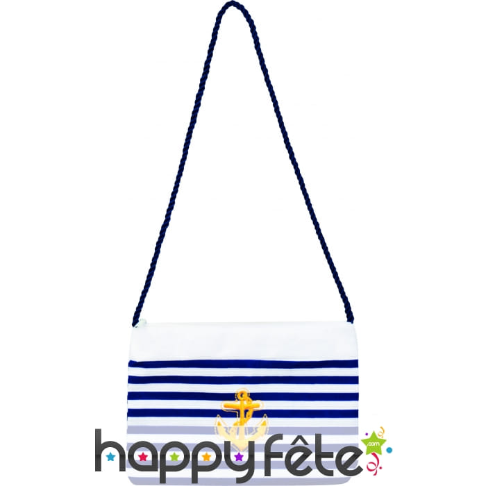 Des rayures bleues et blanches ornent ce bel accessoire et une ancre marine de couleur or est placée sur le devant.