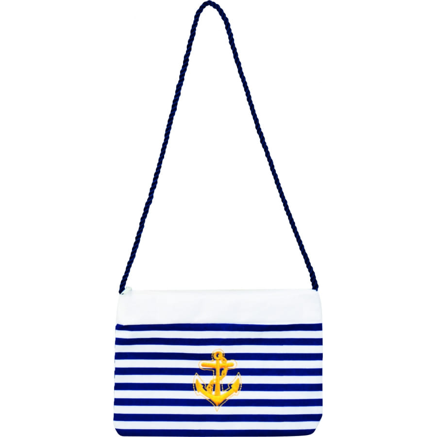 Mesurant environ 21 x 16 cm de longueur, ce sac à main motifs marin en tissu, munie d'une bandoulière bleue, peut vous être utile, si vous partez en pleine mer lors de votre soirée costumée.