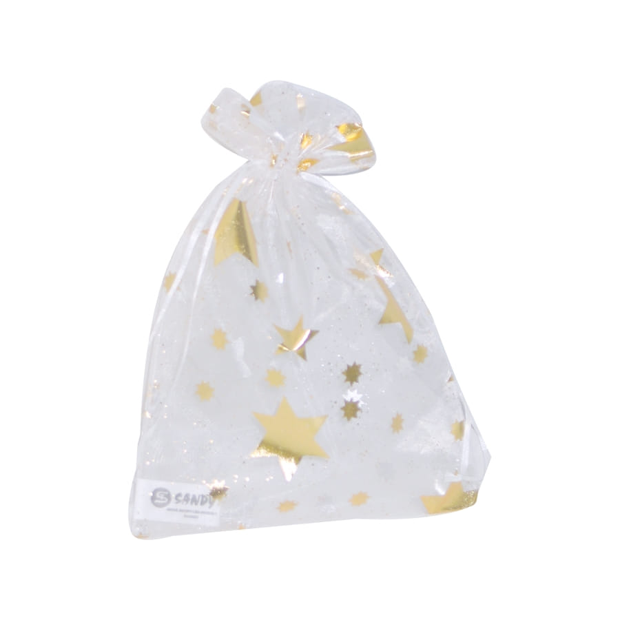 Vous pourrez garnir ce sac a cadeau d'un petit présent. Vous pourrez vous en servir pour offrir quelque chose a vos invités ou a une personne en particulier. De couleur blanc avec des étoiles dorées dessus. Ce sac fait 20 cm sur 18cm environ.