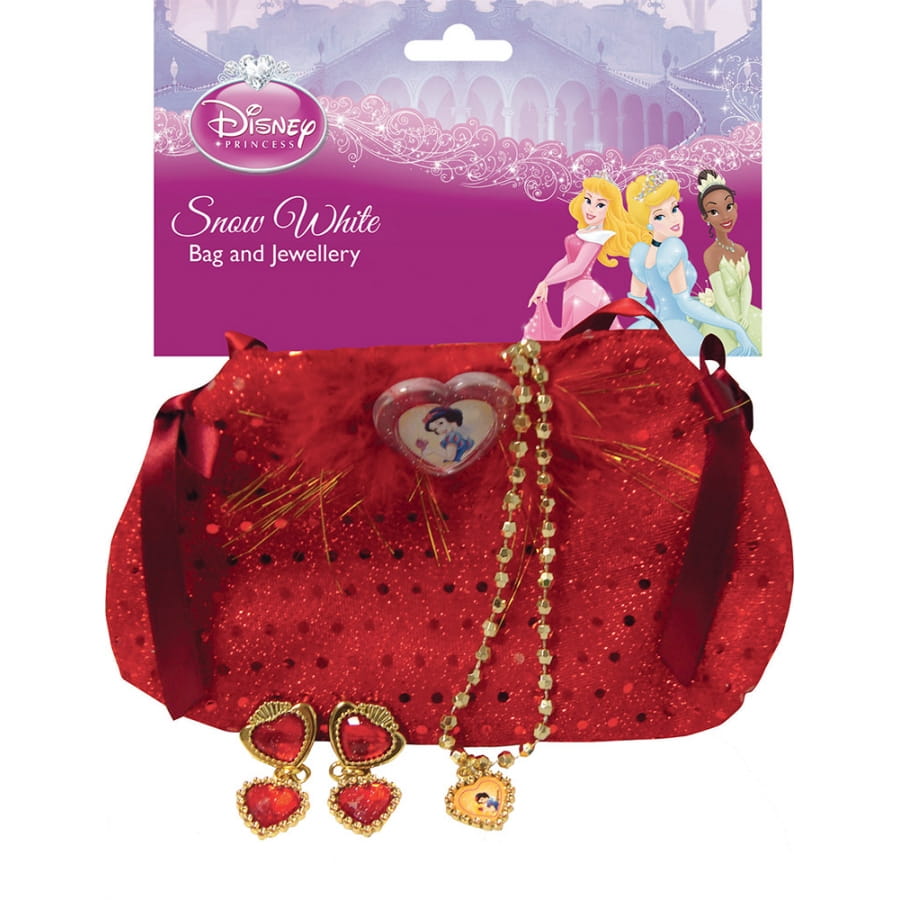 Il est constitué d'un sac rouge orné de strass, de rubans et de plumes, de boucles d'oreilles rouge et doré à clips en forme de coeur ainsi que d'un collier couleur or avec un pendentif décoré du portrait de Blanche Neige.