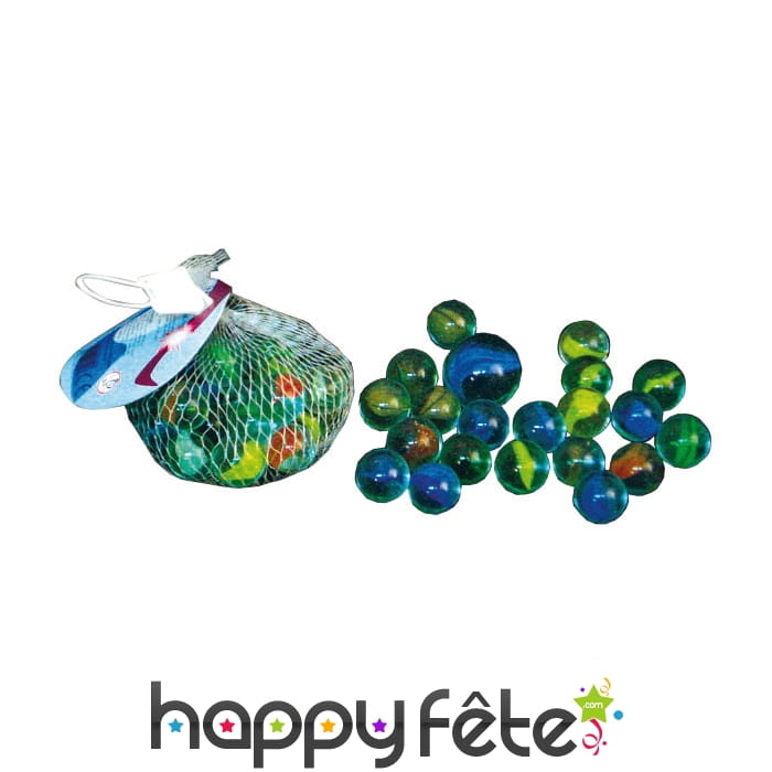 Sachet contenant 20 billes de verre et un calot, pour enfants. Il vous sera impossible de choisir ni le modèle ni la couleur des billes lors de votre commande. Vous les recevrez comme présentées.