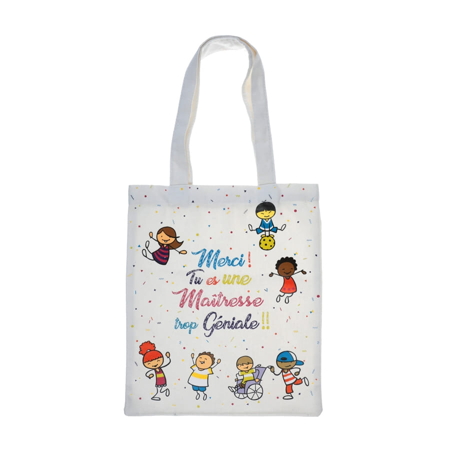 Il s'agit d'un petit cabas de 30 x 37 cm, à fond blanc, imprimé de petits points multicolores, de petits enfants bien souriants, et de cette inscription : "Merci ! Tu es une maîtresse trop géniale !!".