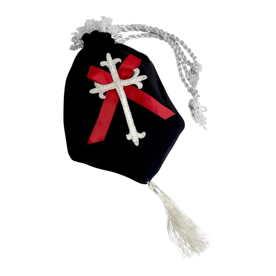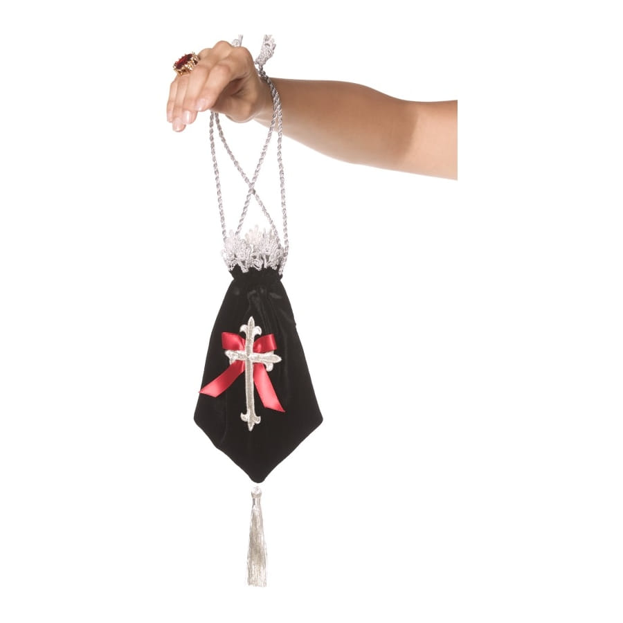 Avec votre tenue de gothique vous aurez besoin de ce sac que votre déguisement soit au complet. Ce sac est de couleur noir avec comme dessin dessus une croix blanche et un ruban rouge. La manche du sac est une corde de couleur argenté, il y a aussi de la dentelle blanche sur le haut du sac.