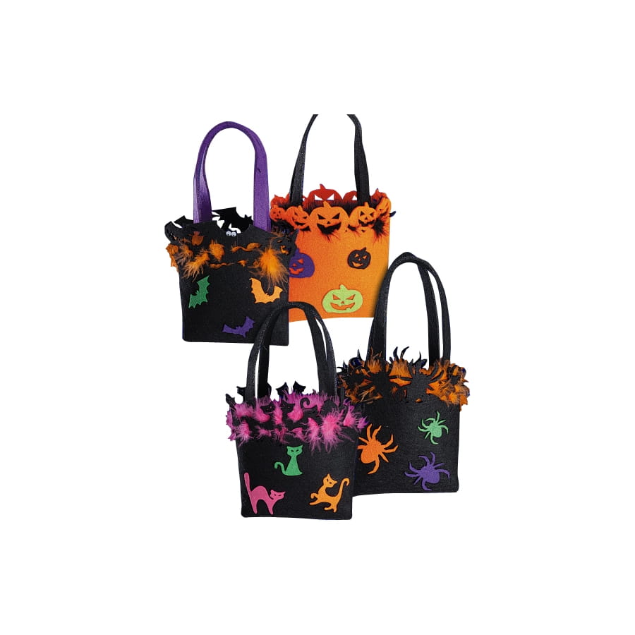 Ses amis lui donnera tous les bonbons que vous désirez pour Halloween. Ce sac avec plume en haut ainsi que des motifs comme araignée, citrouille, chat ou chauve souris de couleur noir, orange, vert et violet. Le sac fait 12 *13 centimètre.