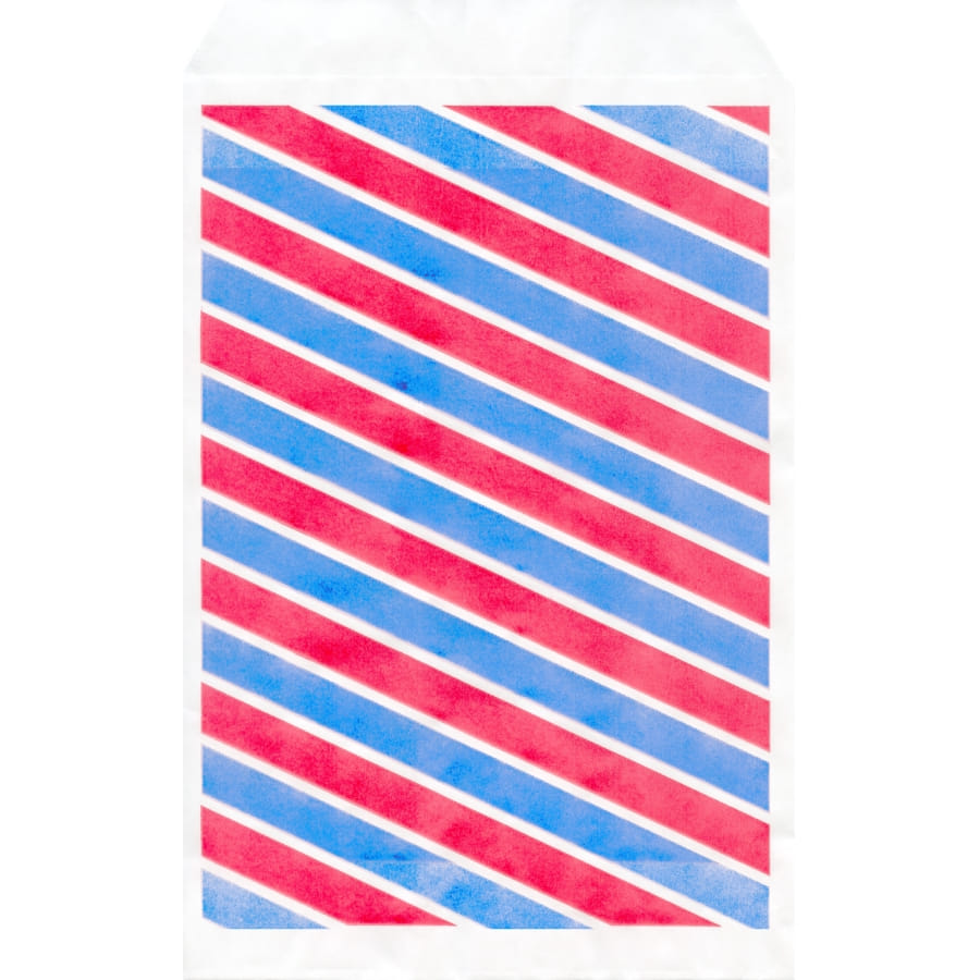 Un sac alimentaire en kraft blanc qui est imprimé de rayures bleu et rouge. Il fait 14*21 centimètres. Ces sacs sont vendus par lot de 100. Vous pourrez vous en servir à plusieurs occasions.