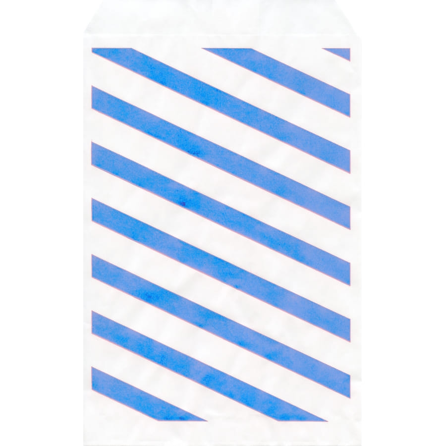 Sac alimentaire en kraft à rayures blanches et bleues, vendu par lot de 100. Cet accessoire mesure 14 centimètres de largeur sur 21 centimètres de hauteur. Ces sacs sont particulièrement pratiques pour un mariage ou un anniversaire.