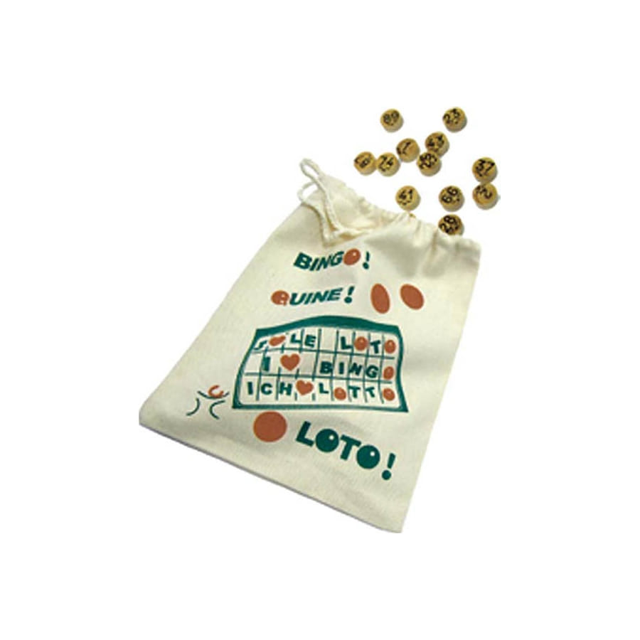 Sac imprimé en toile pour jetons de loto. Le sac mesure 19 centimètres de largeur sur une longueur de 24 centimètres. Le motif est de couleur verte et rouge et basé sur le thème du loto. Ce sac est parfait pour un tirage de loto lors d'une kermesse.