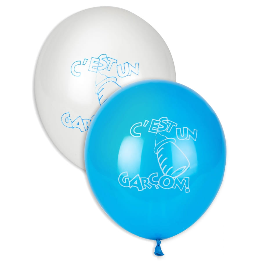 Bébé est enfin là et les parents ne peuvent que partager leur joie d'accueillir ce petit être dans la famille. S'il s'agit d'un petit gars, ce sachet de 10 ballons c'est un garçon sera parfait pour fêter sa naissance. Il comporte 5 ballons bleus et 5 ballons blancs en caoutchouc naturel biodégradable. Chaque ballon est agrémenté de l'inscription "c'est un garçon" accompagné d'un petit motif biberon.