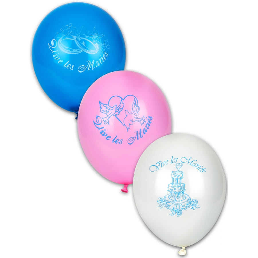 Lorsqu'un couple décide enfin d'officialiser son union, les préparatifs s'enchaînent à n'en plus finir ! Pour vous aider en matière de décoration, happyfete vous a concocté ce sachet de 10 ballons vive les mariés. Il comprend 4 ballons blancs, 3 ballons bleus et 3 ballons roses, tous fabriqués en caoutchouc naturel biodégradable. Vous retrouverez sur chaque ballon l'inscription "vive les mariés".