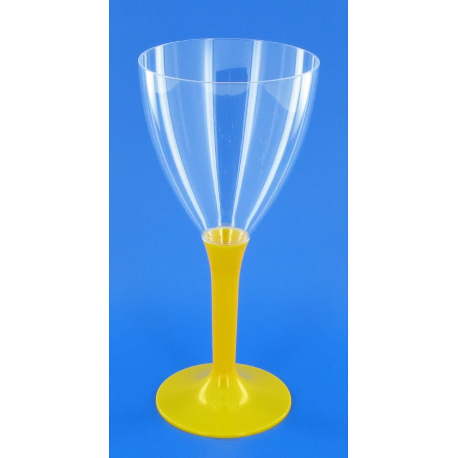 Servez vos bouteilles de vin autrement avec ces verres à vin assez spéciaux ! Le domaine de l’œnologie peut bien s’accorder un peu de fantaisie avec ces verres à vin avec des pieds de couleur jaune. Cela, dans le but de faire ressortir la belle couleur du vin qui sera versé dans ces verres, s'il est jaune par exemple. Chaque sachet contient 10 verres à vin.