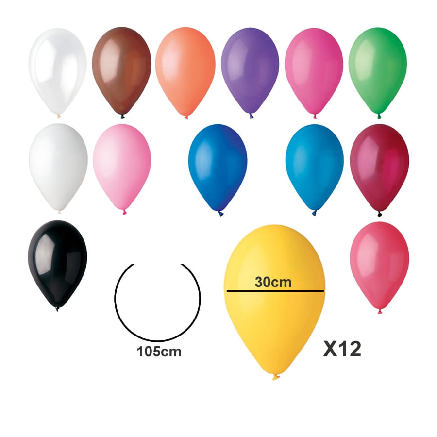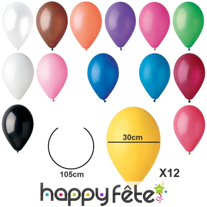 Pour une décoration de fête, les ballons sont incontournables ! Découvrez ce sachet de 12 ballons standards de 30 cm que nous vous proposons ! Chaque ballon a un diamètre de 30 cm et une circonférence de 105 cm. Le sachet comporte 12 ballons de couleurs différentes : Blanc, Bleu moyen, Bleu roi, Bordeaux, Chocolat, Fuchsia, Jaune, Noir, Orange, Rose, Rose bonbon, Rouge, Rouge foncé, Transparent, Vert, Violet.