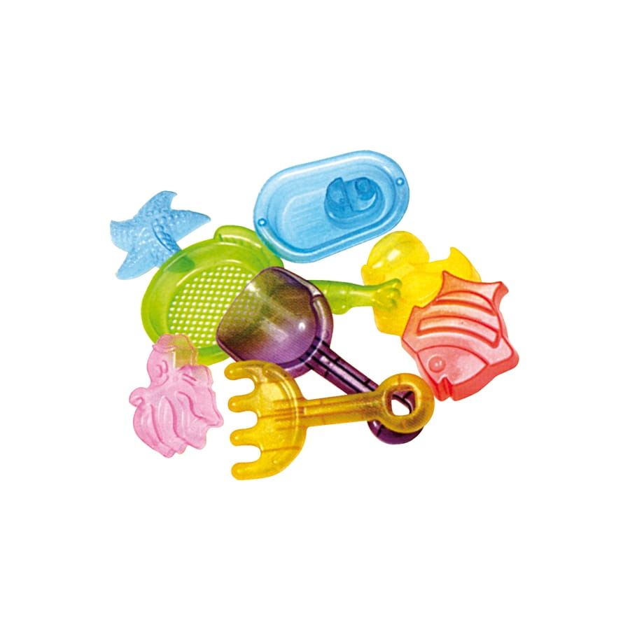 Sachet de 8 jeux de plage multicolores pour enfants. Le sachet inclut moules en forme d'étoile de mer, de poisson, de pieuvre, de canard et de bateau ainsi qu'un tamis, une pelle et un râteau. Votre enfant trouvera plusieurs façons originales de s'amuser.