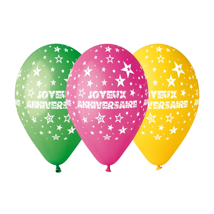 Ballons multicolores imprimés de "Joyeux Anniversaire", vendus en sachet de 10. Chacun des ballons mesure 30 centimètres de diamètre. Ils peuvent être gonflés à l'air ou à l'hélium et sont en latex 100% biodégradable. Faites plaisir à vos proches en décorant la salle de ces ballons à l'occasion de leur anniversaire!