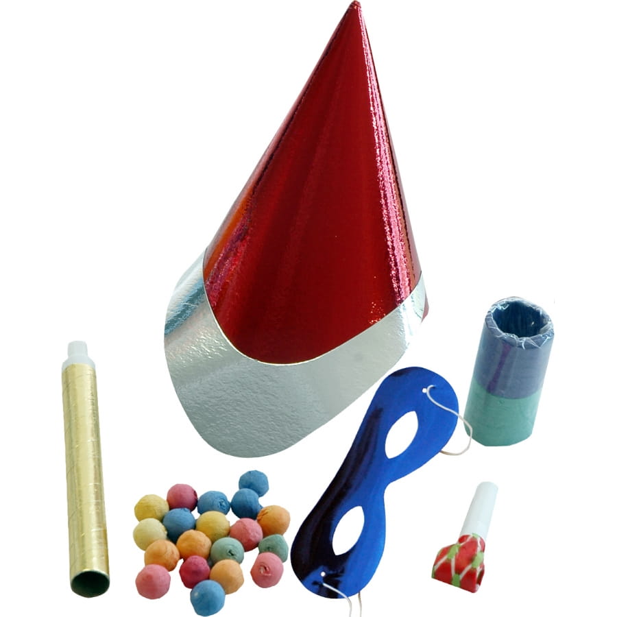 Sachet de cotillons mystère comportant un chapeau, une sarbacane sécurité avec environ 20 boules dancing, un sans-gêne, 10 lancers de serpentins et un loup en carton métallisé. Ce kit d'accessoires de fête est parfait pour un carnaval ou un anniversaire.