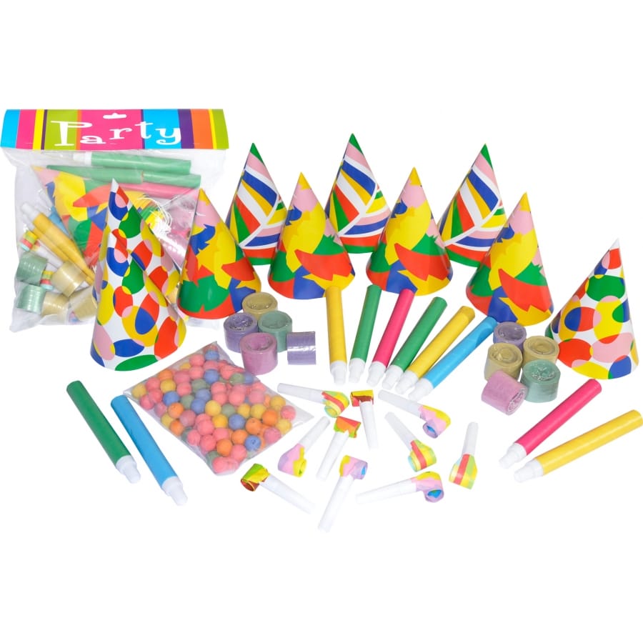 Un sachet de cotillons composé de 10 sarbacanes, 100 boules dancing, 10 rouleaux de 5 serpentins, 10 chapeaux, 10 sans-gêne et 10 coiffes, tous multicolores. Ce kit est idéal pour un carnaval, un anniversaire, la Noël ou le Nouvel An.